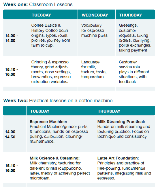 - Classroom lessons include an introduction to coffee and the barista role, vocabulary for types of coffee; “café English” – speaking and listening skills in a café setting.
